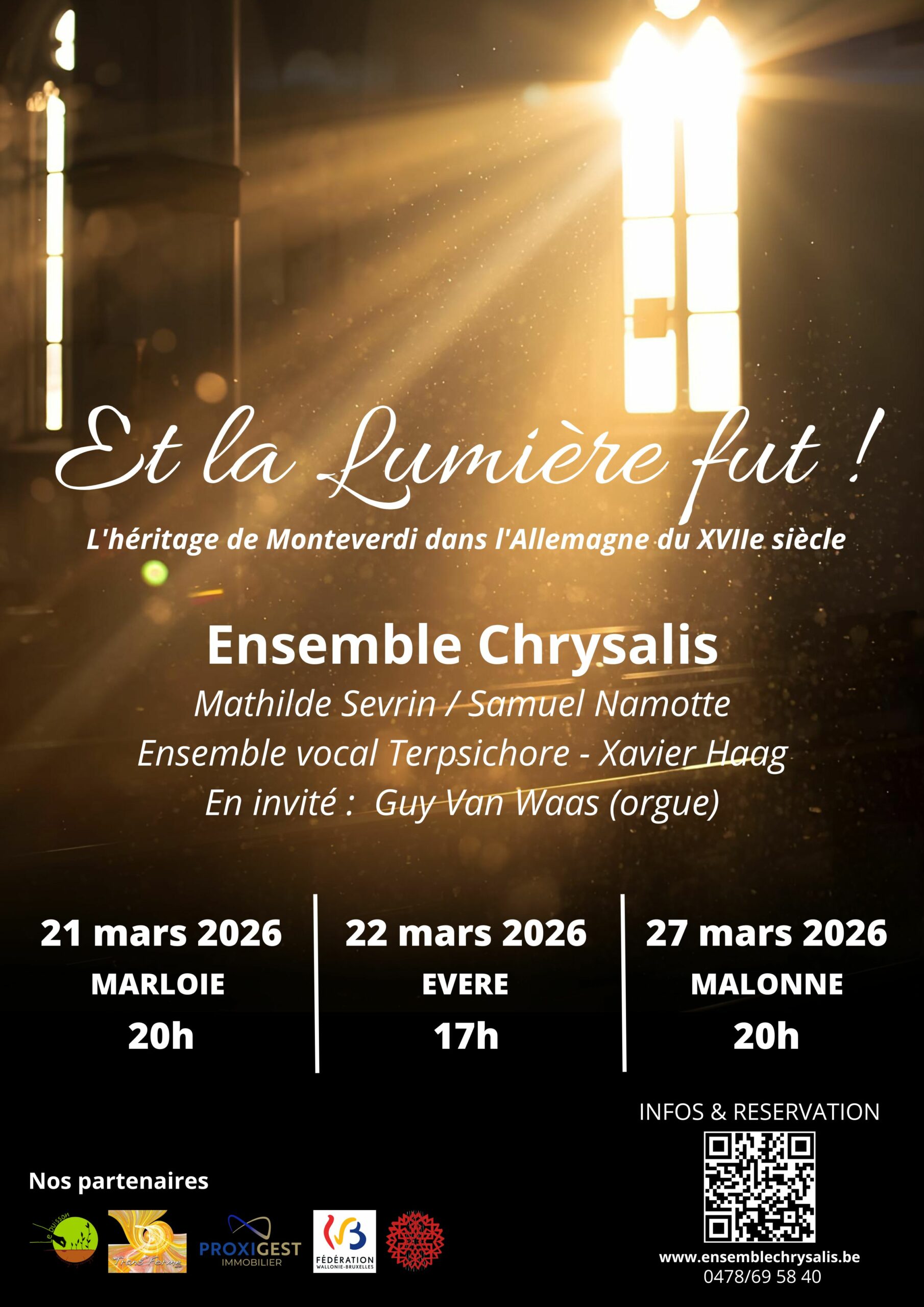 Le programme musical proposé par l’Ensemble Chrysalis nous conduit de l’exubérance au vide abyssal, de la profusion à la désolation, aux lamentations, pour nous ramener ensuite avec espoir vers la confiance et la joie. La narration dramatique du programme, en trois actes, emprunte le chemin de la Résurrection, du Phénix renaissant de ses cendres, du Printemps succédant à l’hiver. « Et la lumière fut !» est aussi l’évocation de la descendance de Monteverdi dans les contrées germaniques du XVIIe siècle, la contagion du style baroque naissant, de la primauté nouvelle et absolue des émotions et du subtil art de les théâtraliser.